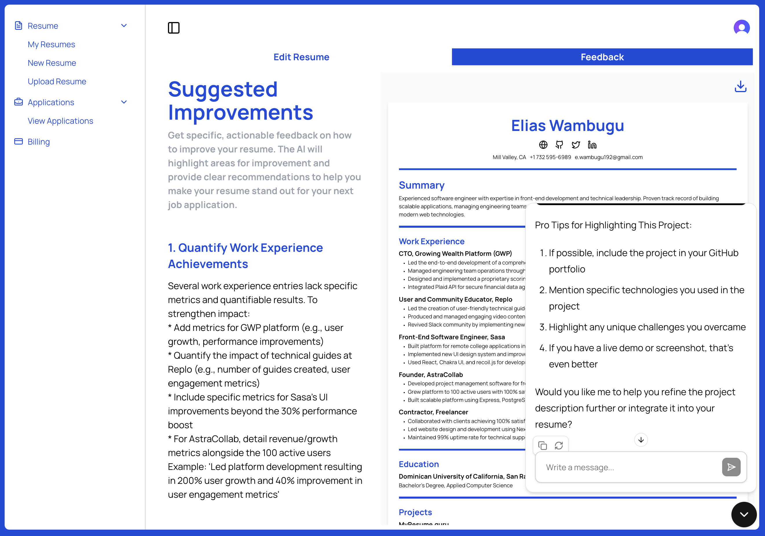 Your resume is often the first thing a potential employer sees, so it's important to make a good impression. MyResume Guru makes it easy to get feedback on your resume, so you can feel confident that you're putting your best foot forward.